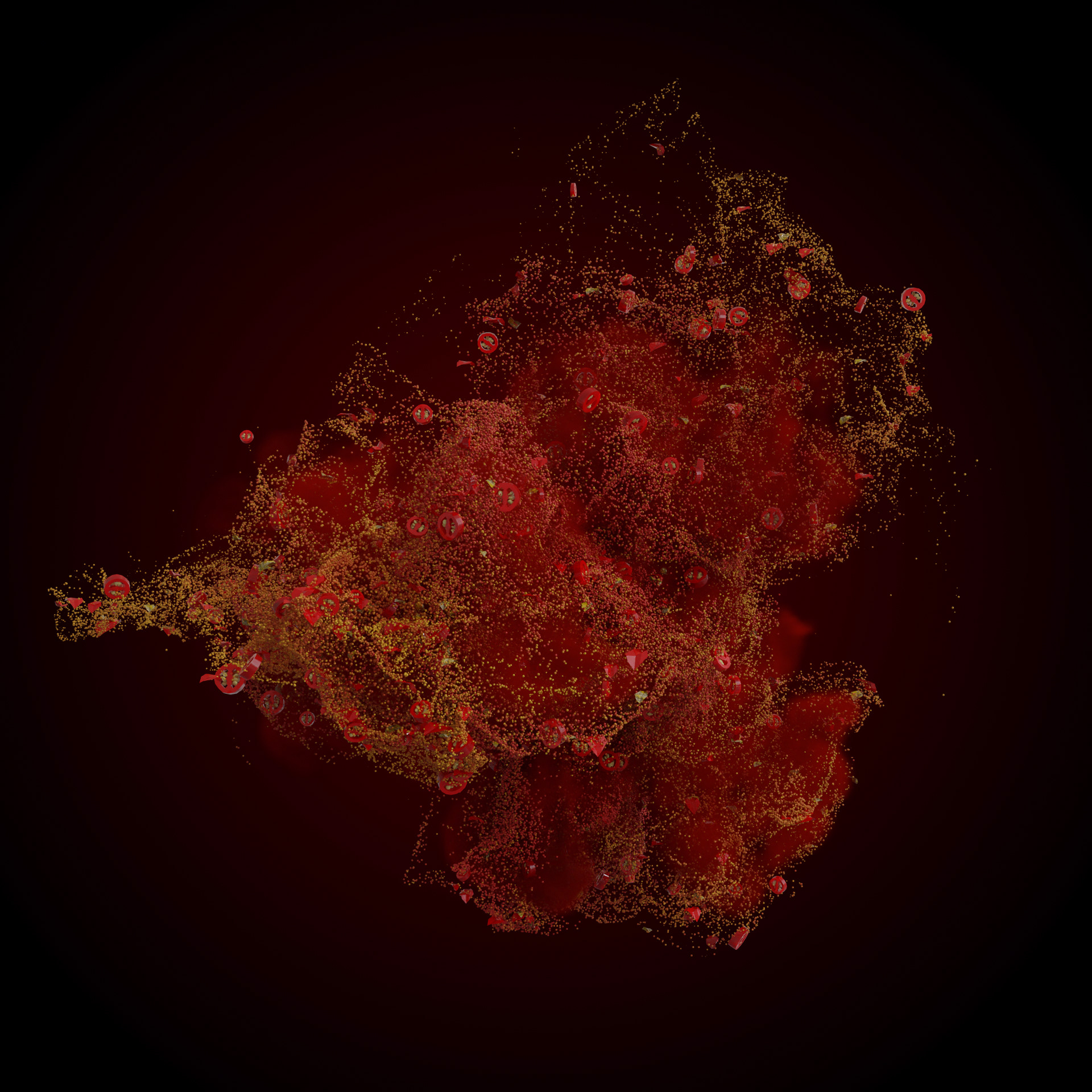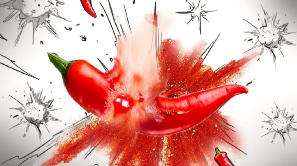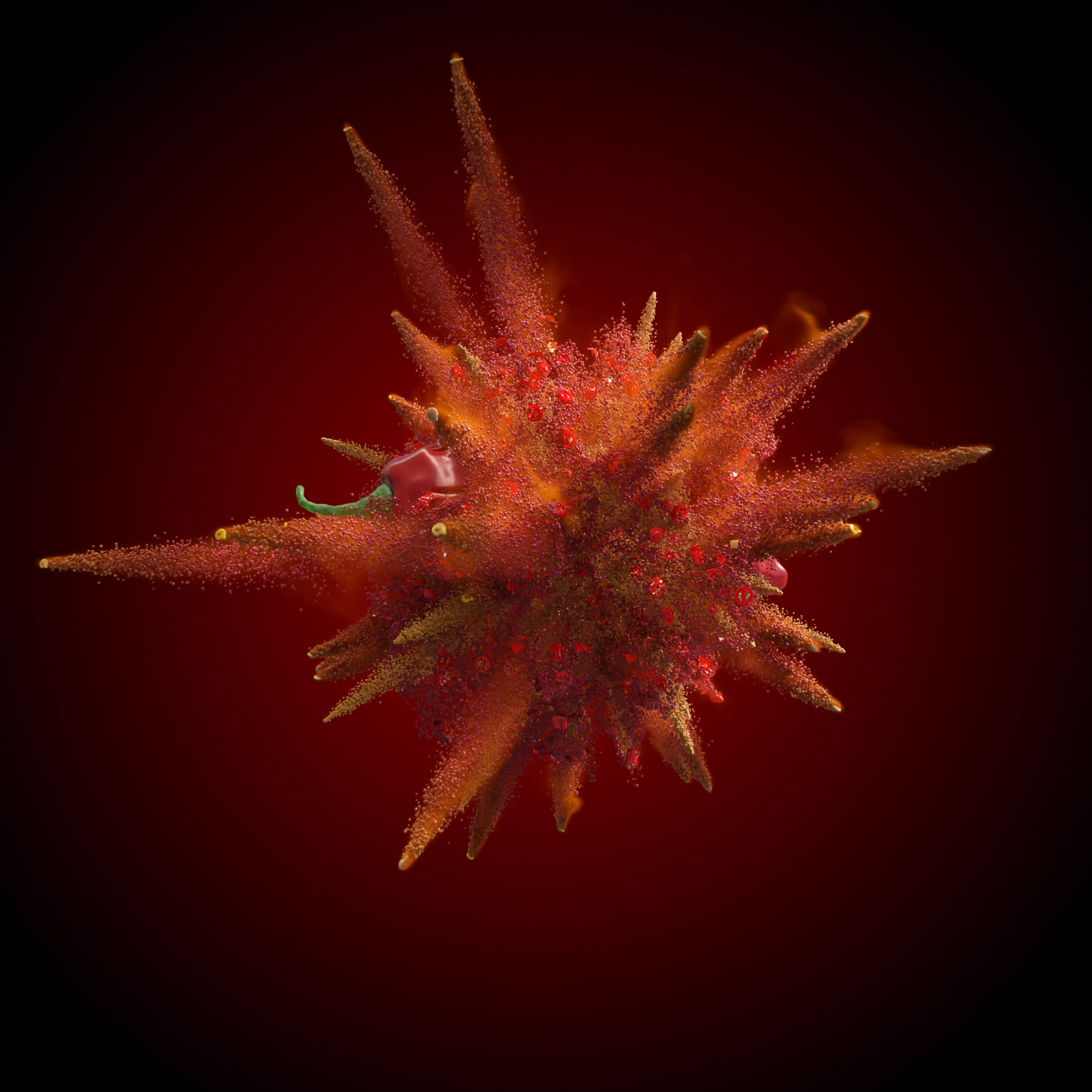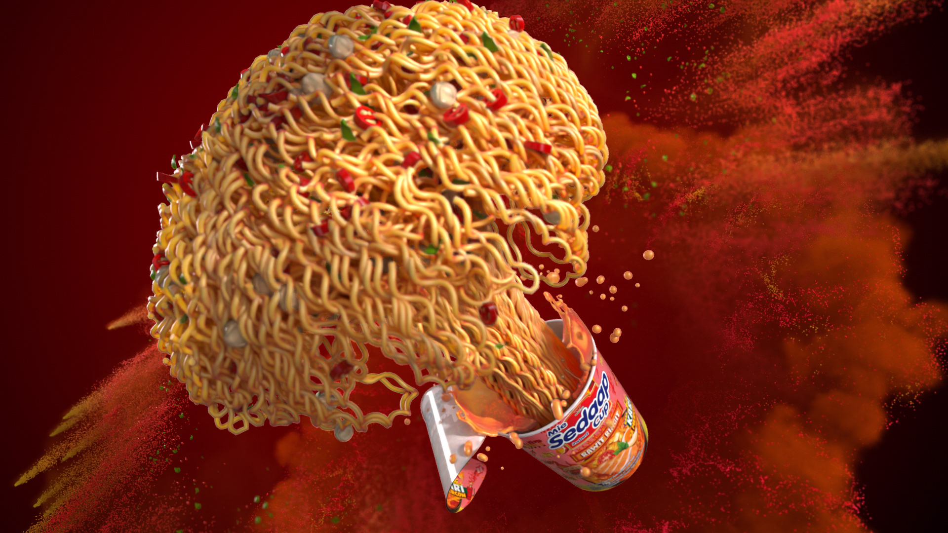 In this commercial, the director wanted to highlight the spicy sensation through powerful visuals of exploding noodles and chilies. To bring this vision to life, we created 3D chili models combined with particle explosion effects enhanced by chili slices. We also used pyro simulation in Houdini to produce a dynamic, energetic noodle explosion effect.