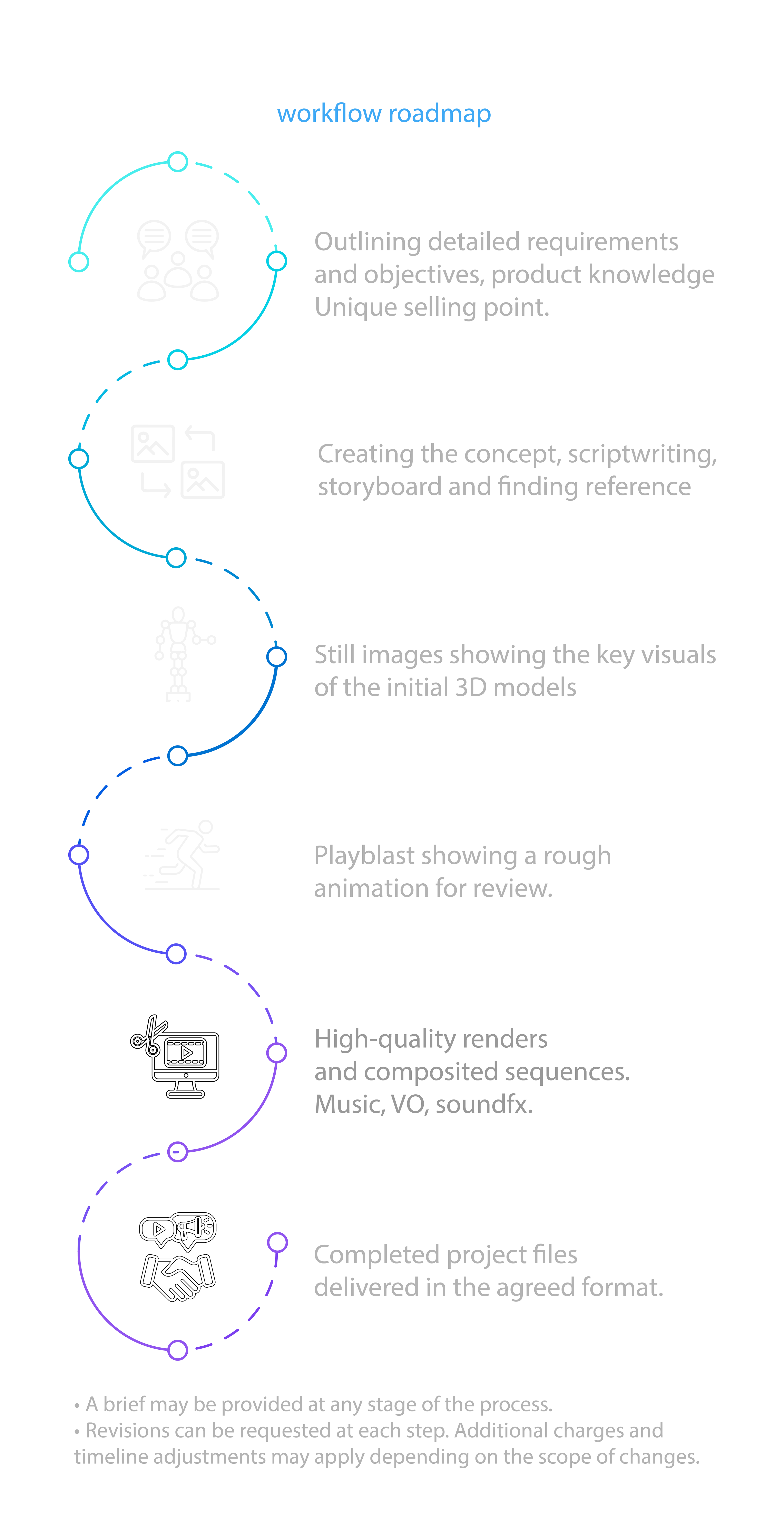 My workflow begins with the concept, storyboard, and references, followed by a project brief to set goals and requirements. The process then moves through three work-in-progress stages: modeling with still images of the key visuals, a playblast preview for rough animation, and rendering with compositing to finalize the look. The project concludes with the final delivery in the agreed format. A brief can be shared at any stage, and revisions are possible throughout the process with additional cost and timeline adjustments if needed.